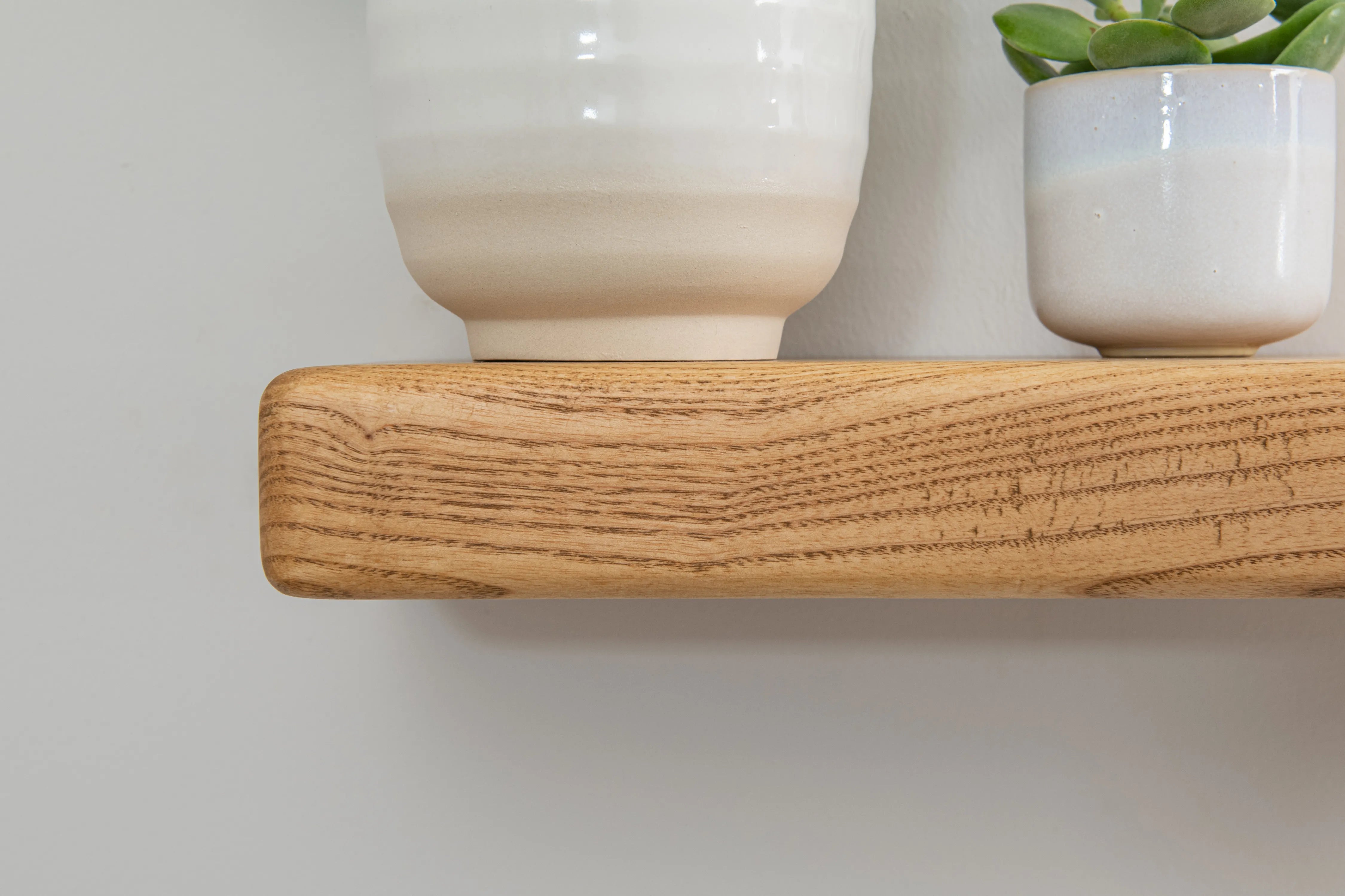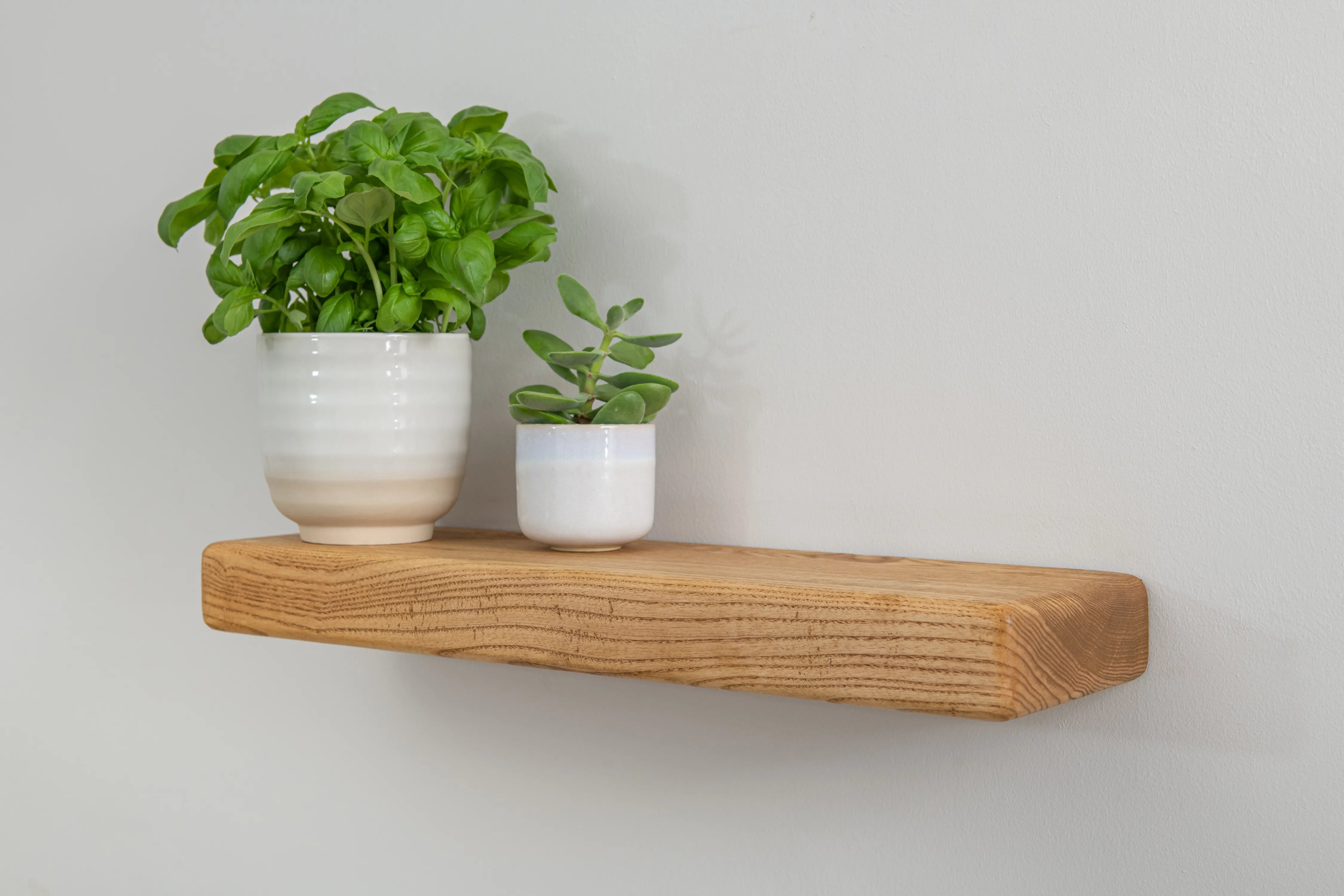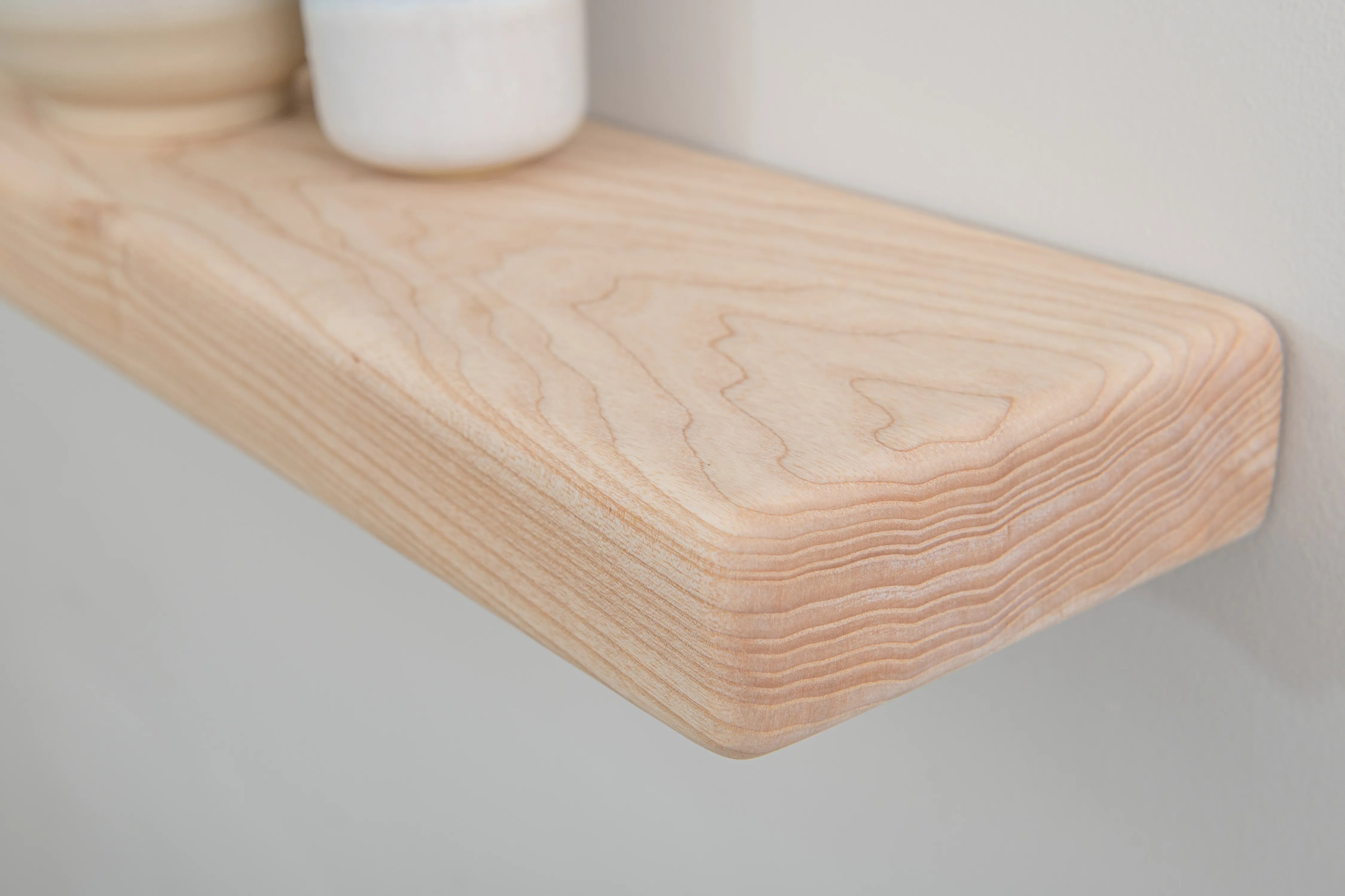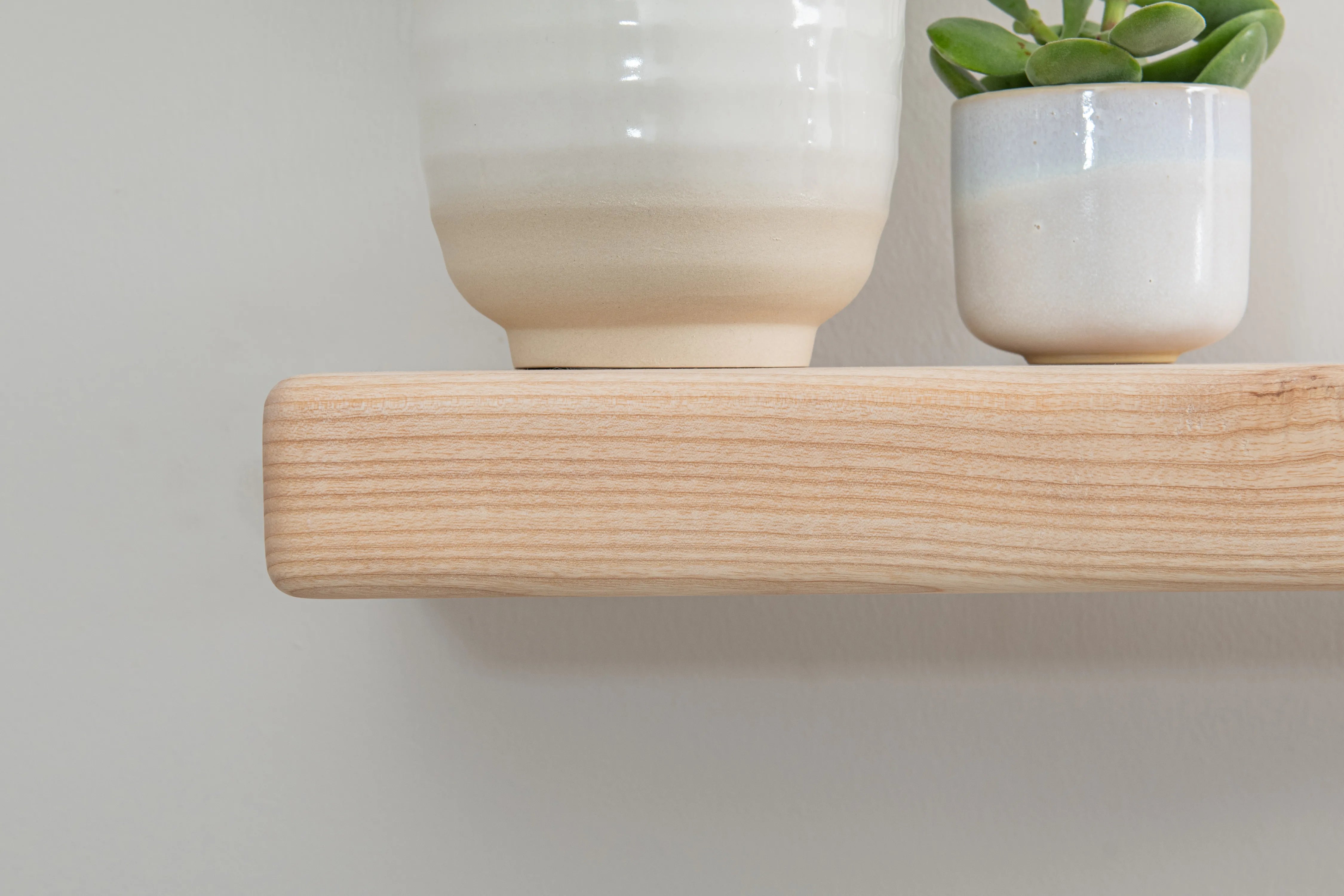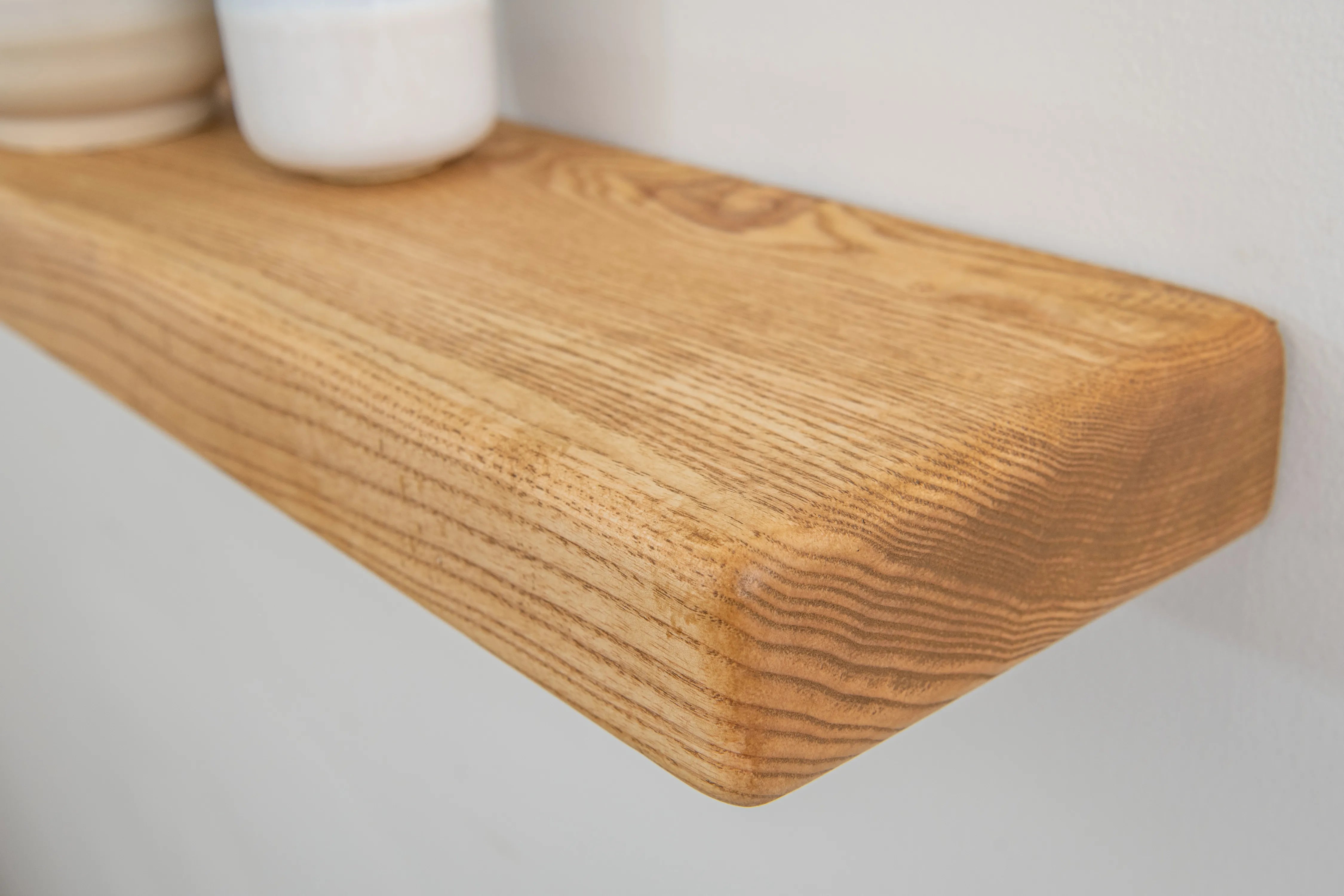 Solid ash floating shelf with farmhouse character and rounded edges. A practical, stylish display for books and décor.