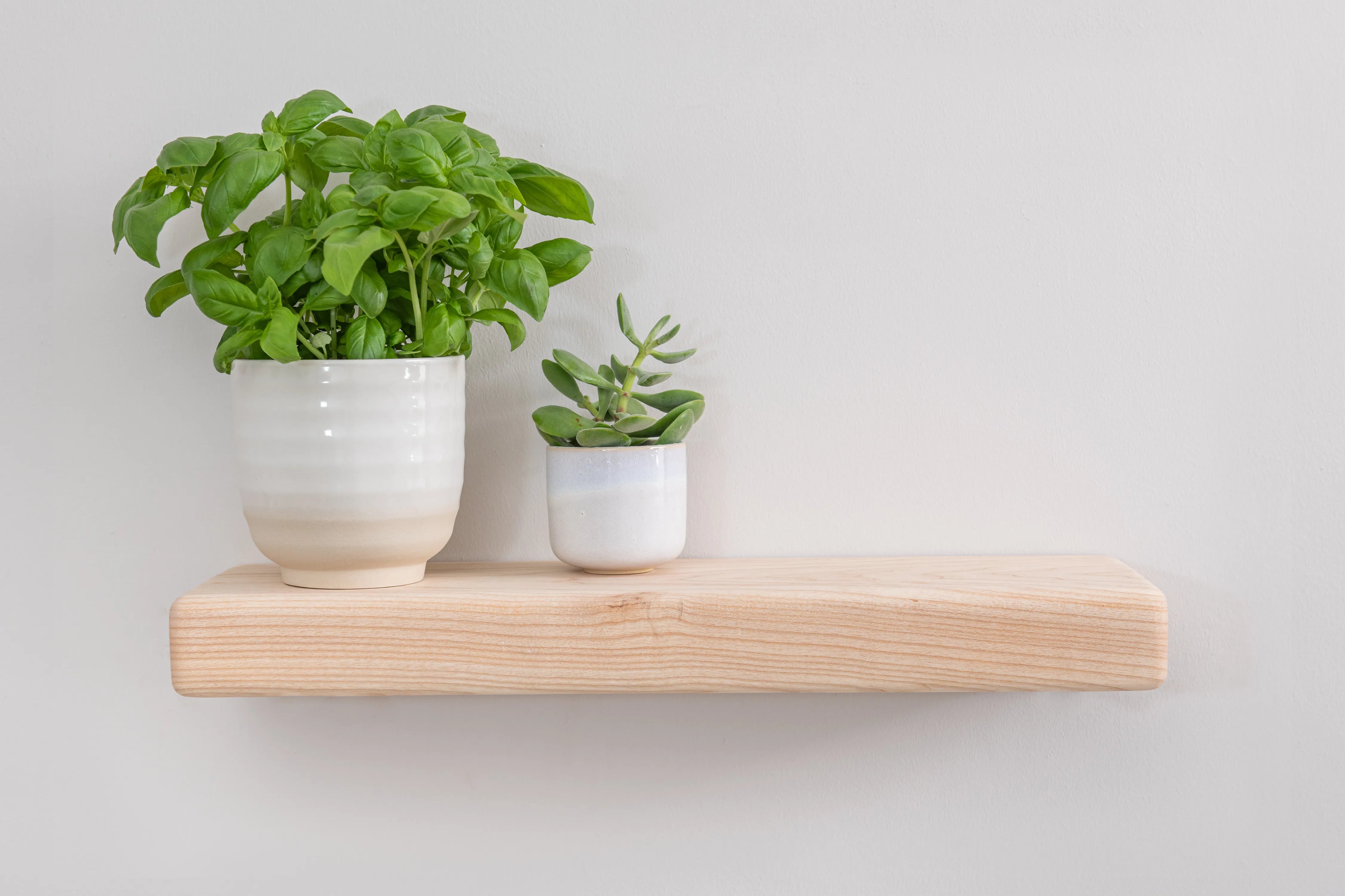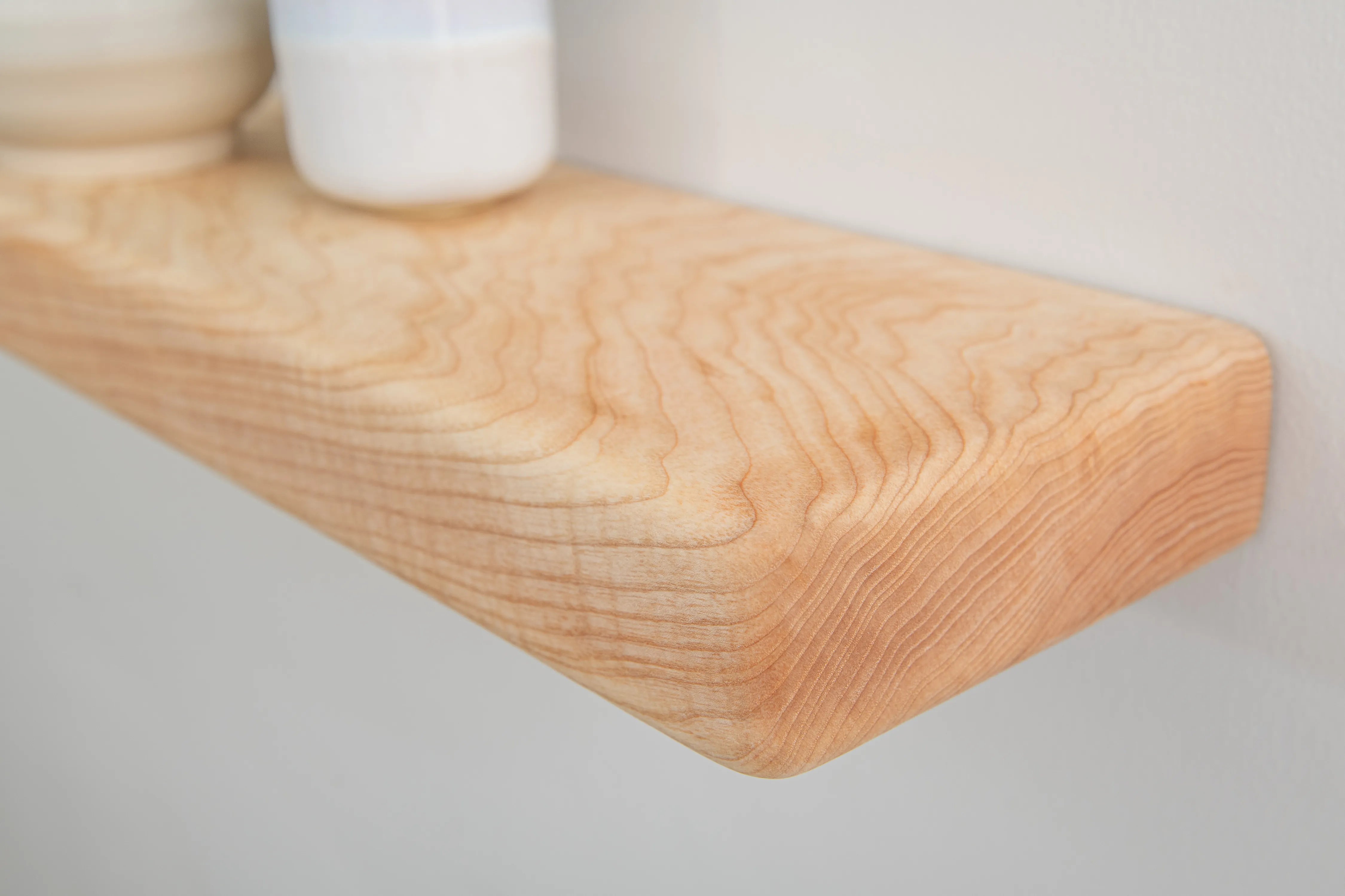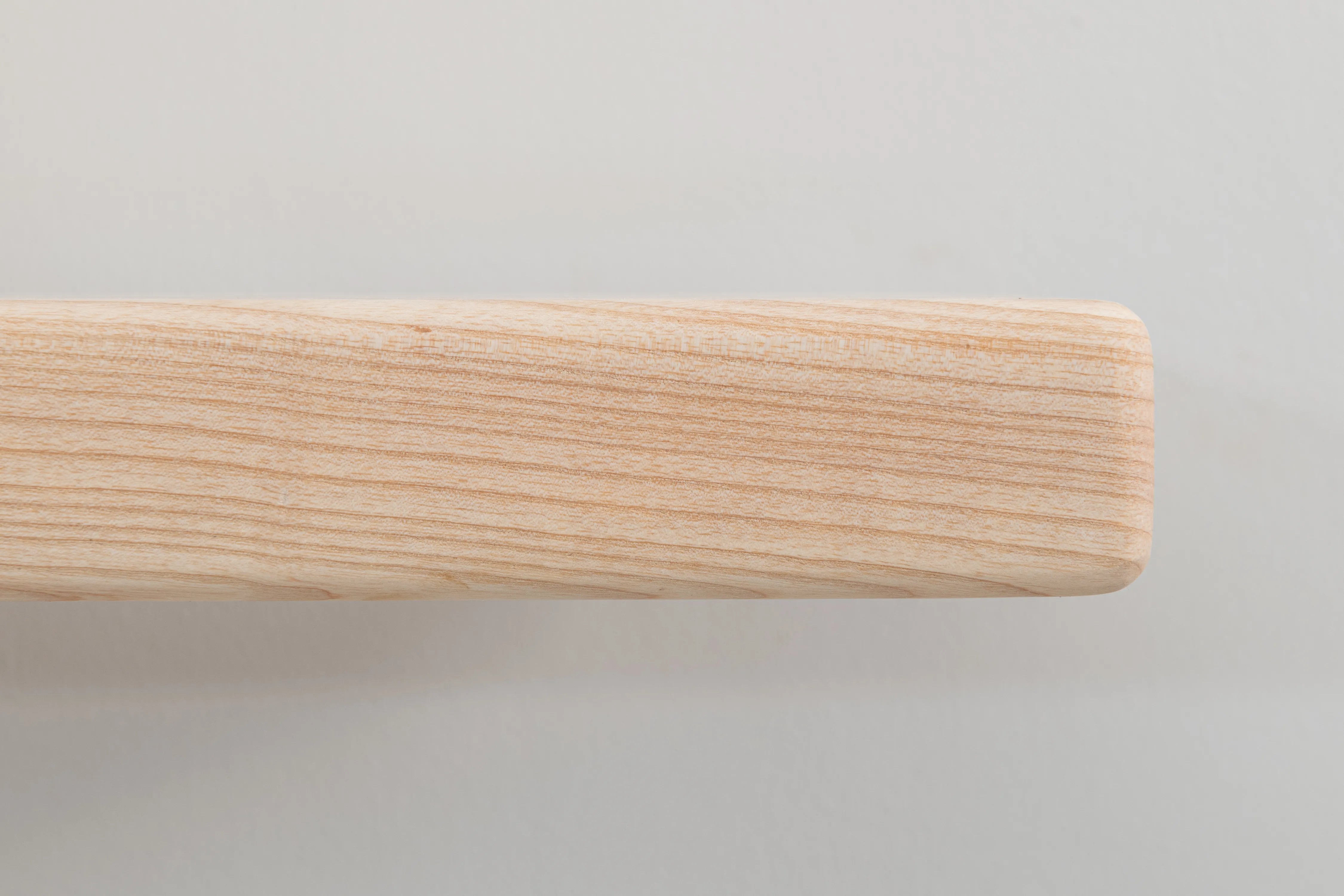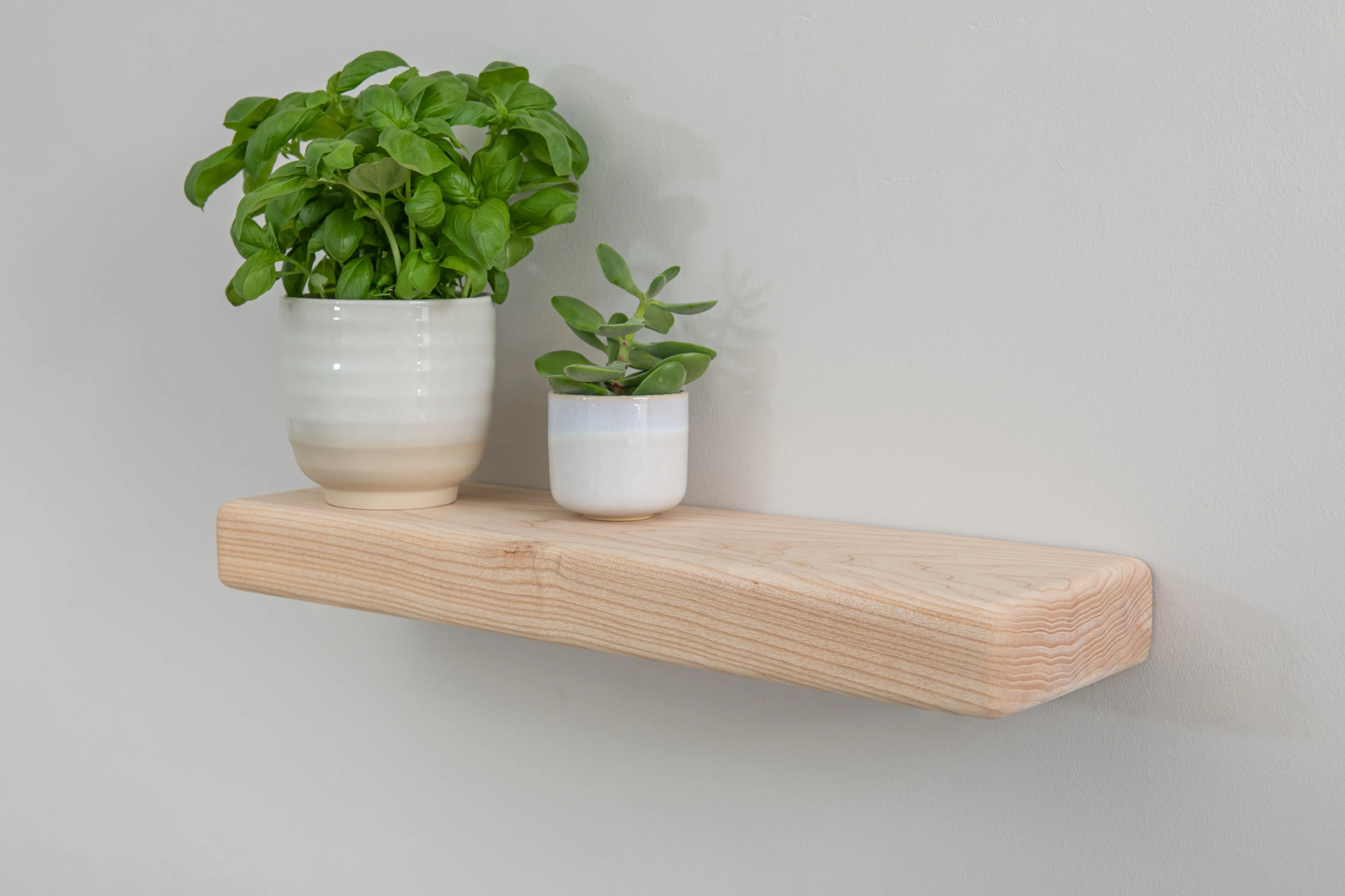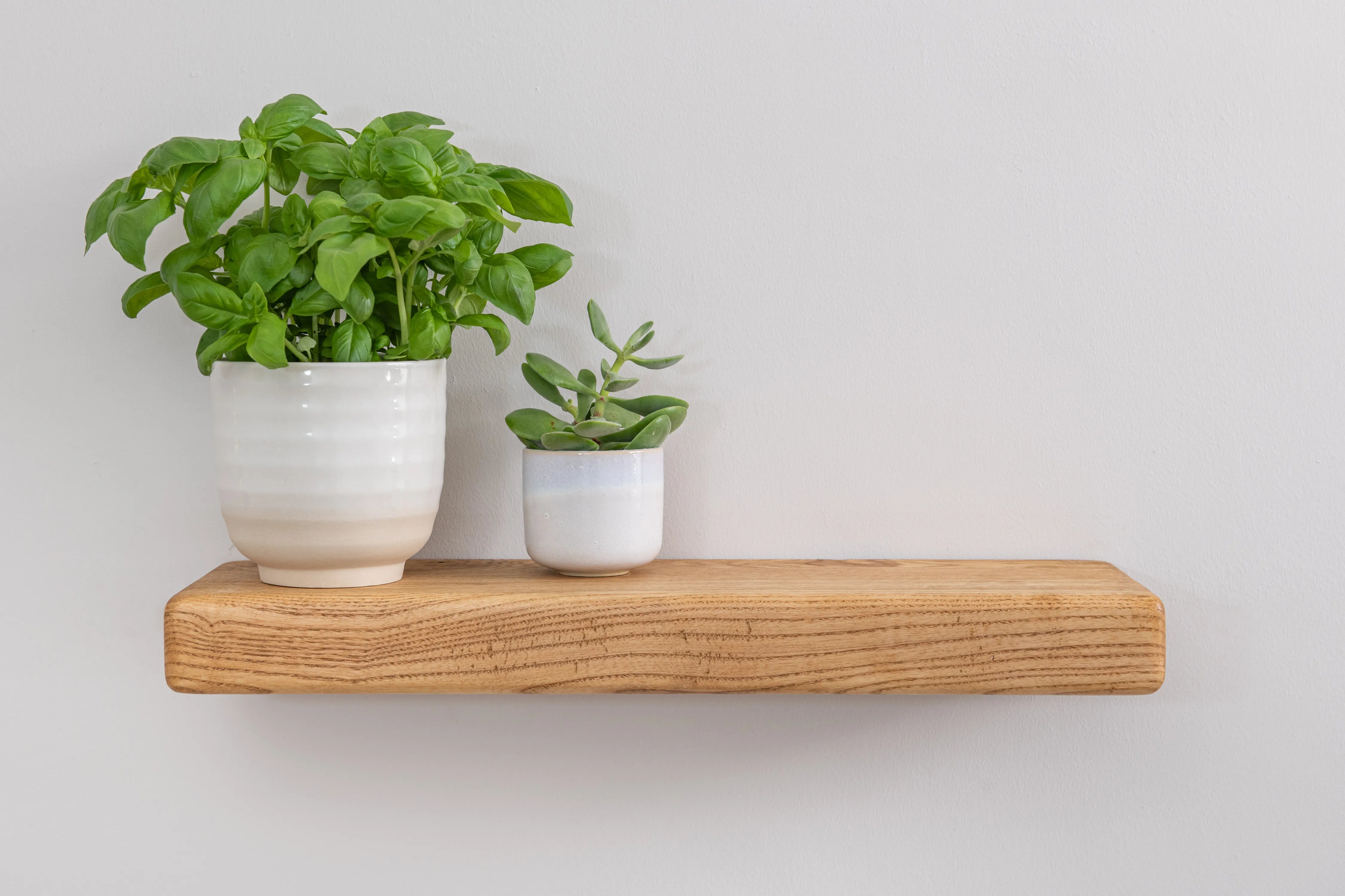 Solid ash floating shelf with farmhouse character and rounded edges. A practical, stylish display for books and décor.
